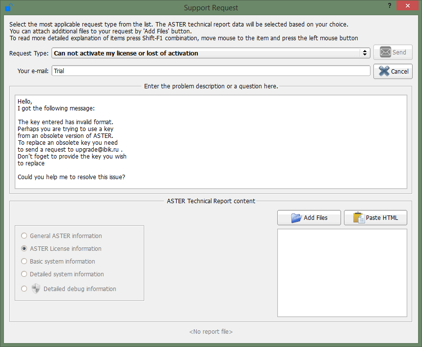 You may select a request type which is the most suitable for your situation from the Request Type list (upon opening this dialog from the error message box the most suitable type will be chosen automatically). Based on this selection there will be formed the content of the ASTER Technical report, i.e. information that will help to solve the problem, and will be sent to ASTER Support.