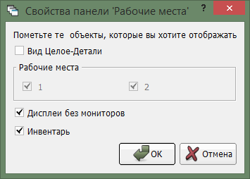 В группе «Рабочие места» можно выбрать, какие окошки рабочих мест отображать, а какие скрыть (нельзя скрыть, если рабочему месту назначены устройства). Обратите также внимание на галочку возле пункта «Дисплеи без мониторов» в этом диалоге, а также на полупрозрачные («выключенные») изображения дисплеев. На самом деле изображения дисплеев представляют видео поверхности видеокарт, которые потом могут быть подключены к реальным видеовыходам и, соответственно, мониторам. Полупрозрачность изображения дисплея отражает тот факт, что данная видео поверхность в данный момент не подключена к монитору. Пункт «Дисплеи без мониторов» определяет, будут ли отображены такие дисплеи, или нет. По умолчанию галочка сброшена, и полупрозрачные дисплеи не отображаются. Дисплей может быть полупрозрачным даже в том случае, когда монитор физически подключен к видеовыходу и включен в сеть, но не включен в рабочий стол Windows.