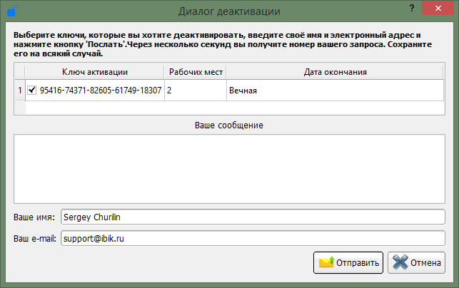 Выберите лицензии, которые требуется деактивировать и введите сообщение с описанием причины деактивации, и хотя это и не приветствуется, можете указать особые пожелания насчет деактивируемых лицензий (например, чтобы привязать новые лицензии, к другим имени и(или) адресу электронной почты). Измените, если необходимо, имя и адрес в полях «Ваше имя» и «Ваш e-mail», эти данные будут использованы при генерации серийных номеров, которые вы получите взамен деактивируемых. После успешной отправки запроса, появится сообщение с уникальным номером запроса. Этот номер рекомендуется сохранить на всякий случай (например, для ссылки на запрос в случае возникновения каких-либо проблем).
