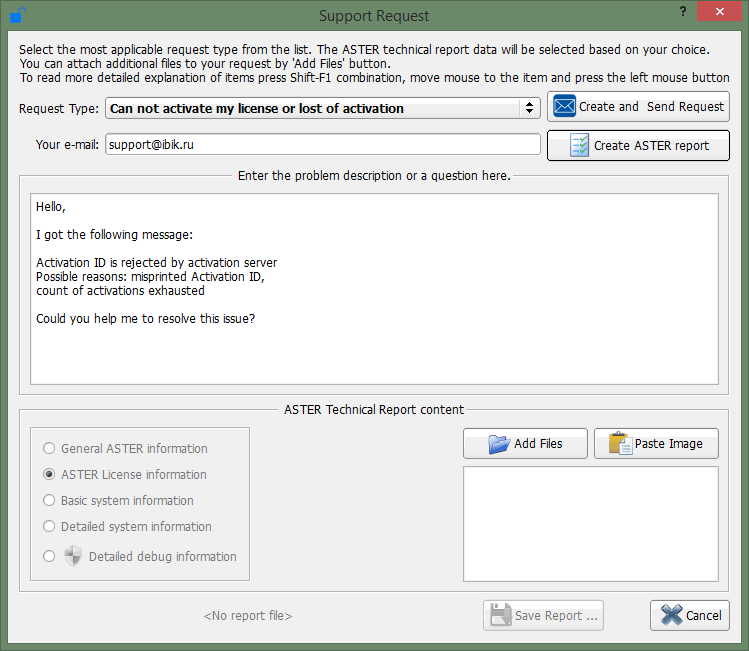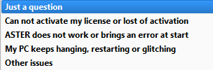 · «Cannot activate my license or lost of activation» – as a rule, is selected automatically when activation errors emerge. You should choose this item when you meet other problems with activation and licensing, for example, when suddenly ASTER activation disappears. In this instance, the report file will include information on ASTER licensing (item «ASTER License information»).